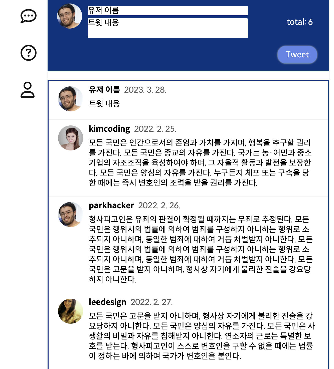 오늘은 리액트의 기본 문법인 props와 state를 활용해 트위터와 유사하게 만들어진 웹페이지가 실제로 작동하도록 코드를 작성해보고