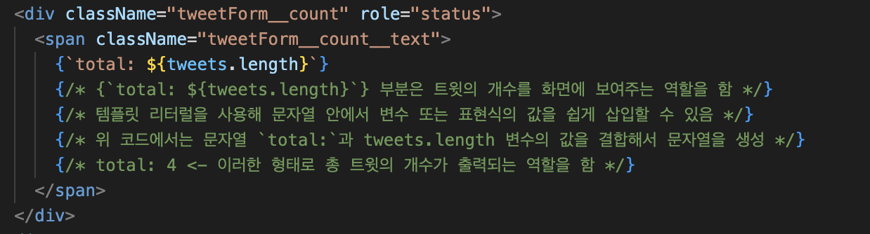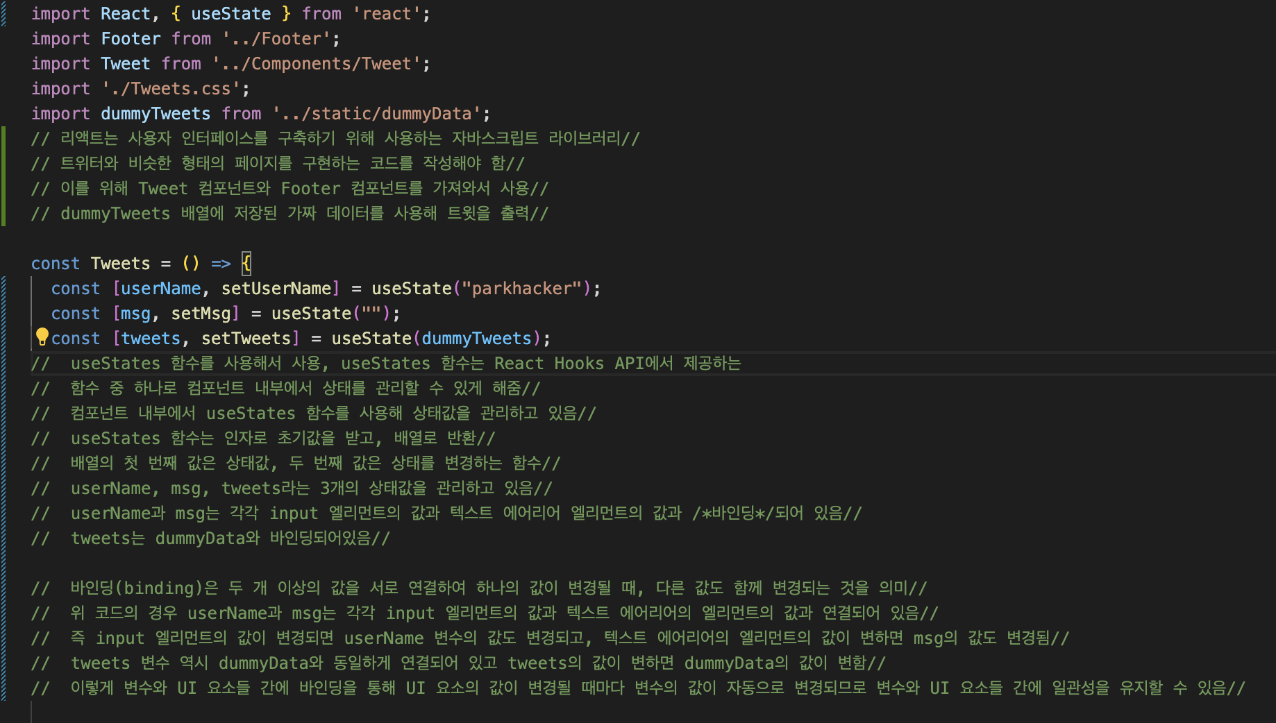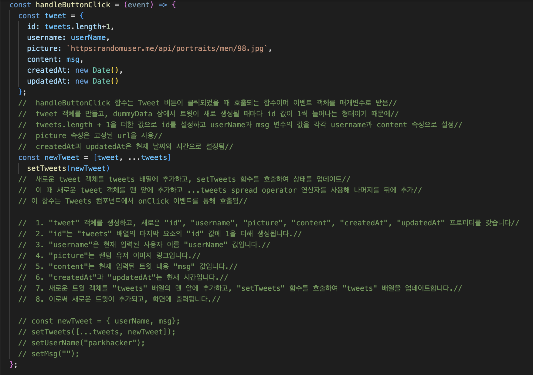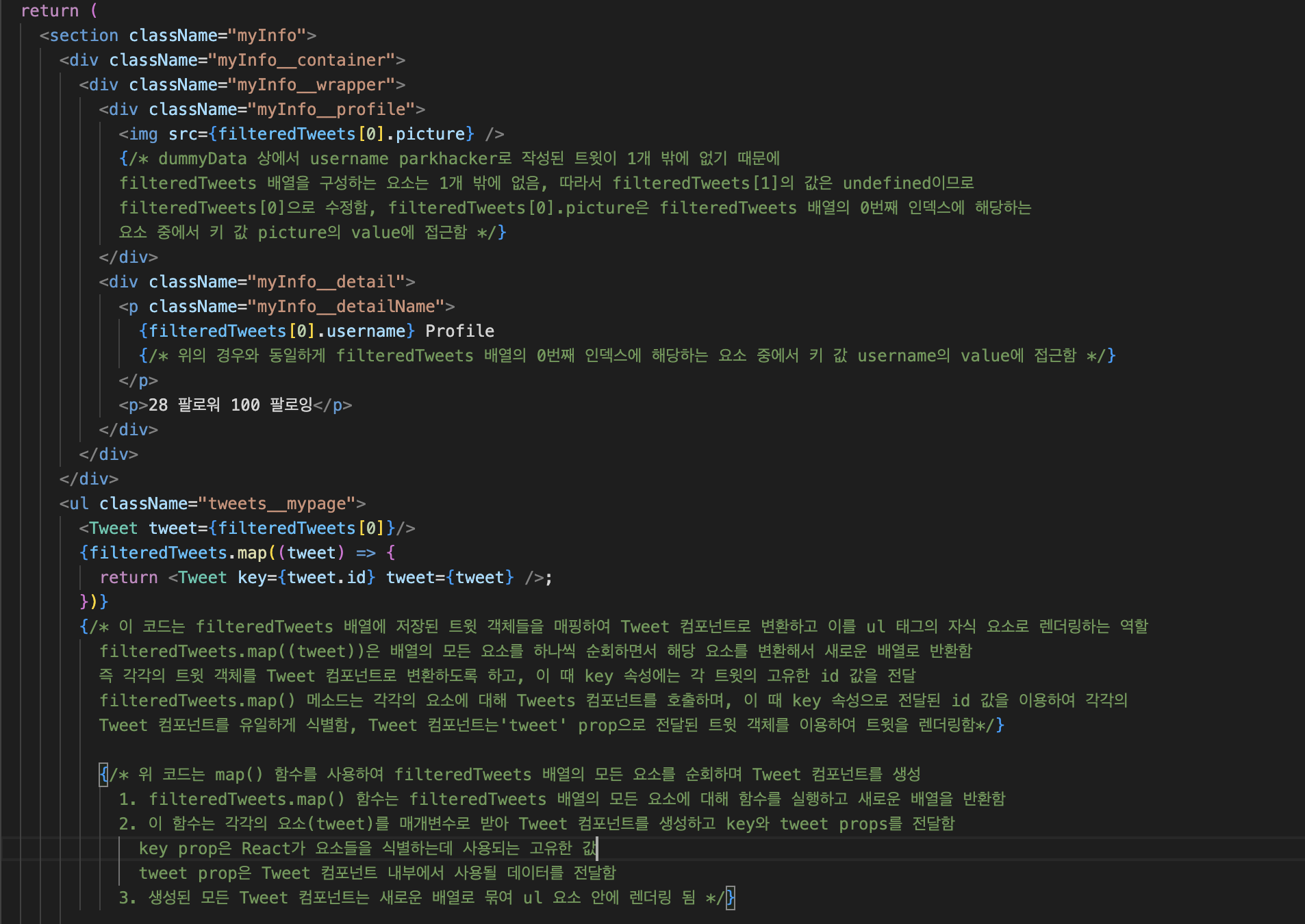 Tweets.js 파일의 코드에 대한 의사코드이다. 자세하게 코드를 설명하듯이 의사코드를 작성하는 과정을 통해 머릿속에 내용이 더 확실하게 자리를 잡게 되어서 앞으로 접하는 모든 코드들을 이렇게 분석해보는 습관을 들여야겠다고 생각하게 되었다.
