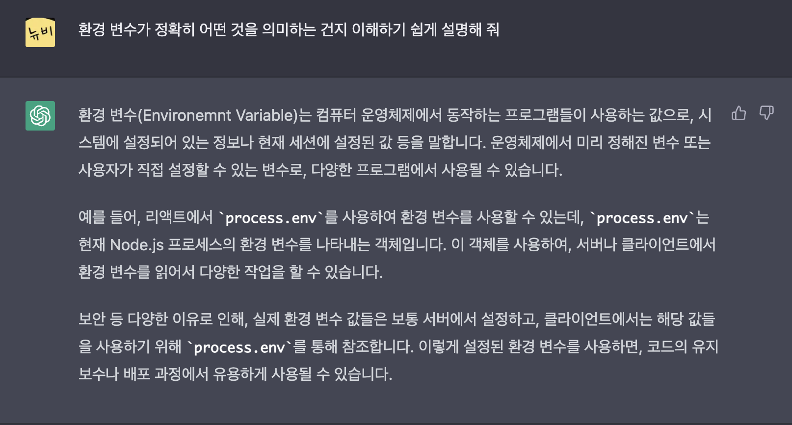 그래서 환경 변수가 무엇인지도 물어보았다. 알아두어야 할 개념인 것 같지만, 지금은 이렇게 다소 심화적인 부분에 몰입하는 것보다 기본적이고 필수적인 지식을 습득하는 것을 우선순위로 두어야 할 것 같아서 체크만 해두고 넘어갔다.